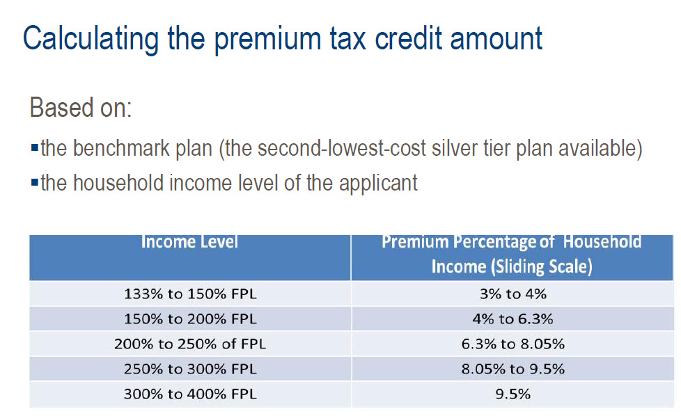Premium tax credits are calculated based on the applicant’s household income and cost of the benchmark plan (Silver Level Plan). If you are eligible for a tax credit, it will automatically be paid by the government to the insurance company to reduce your monthly premium. Because it can be difficult to accurately predict the annual household income, any necessary adjustments to the subsidy you received will be made on your tax return.